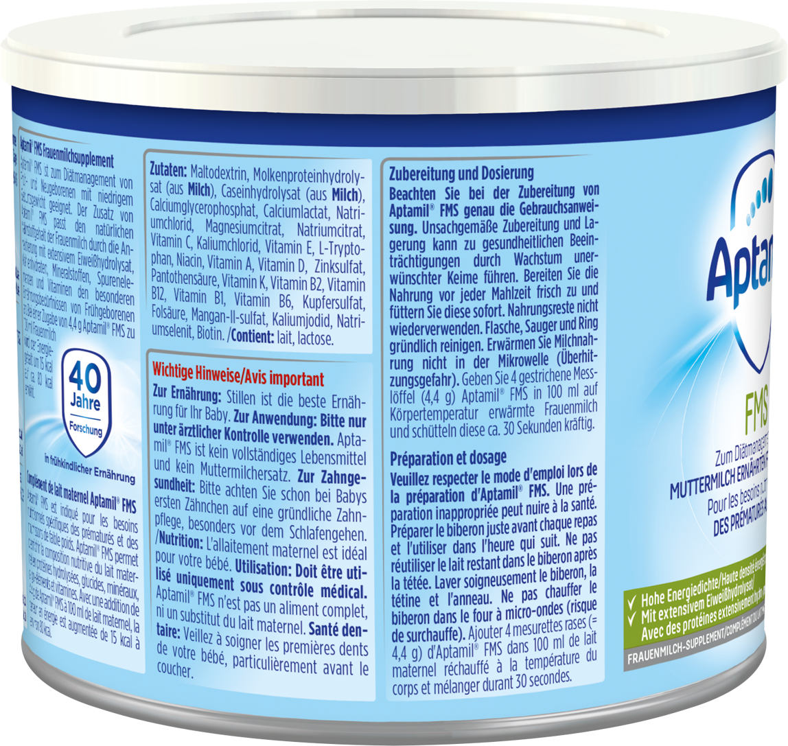 Aptamil FMS thích hợp để làm giàu sữa mẹ cung cấp dinh dưỡng cho trẻ sơ sinh sinh non và nhẹ cân. Việc bổ sung Aptamil FMS điều chỉnh thành phần tự nhiên của sữa mẹ phù hợp với nhu cầu dinh dưỡng đặc biệt của trẻ sinh non.